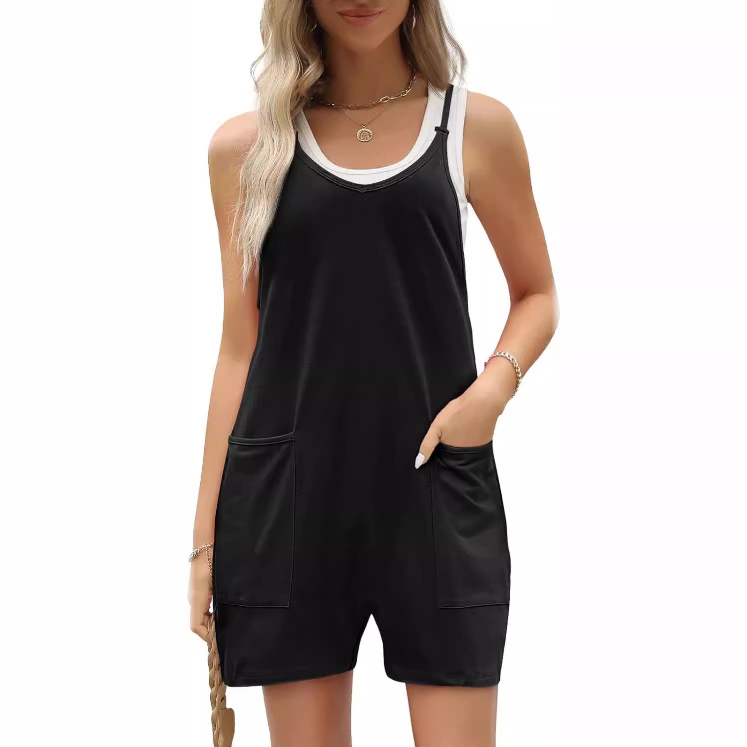 This women's casual romper is the perfect choice for summer outings, featuring a sleeveless design with delicate spaghetti straps that offers a cool and breathable feel. The loose-fit shorts provide comfort and ease, while flattering a variety of body types with a relaxed, effortless look. Fashion-forward utility elements and practical pockets add both style and functionality.